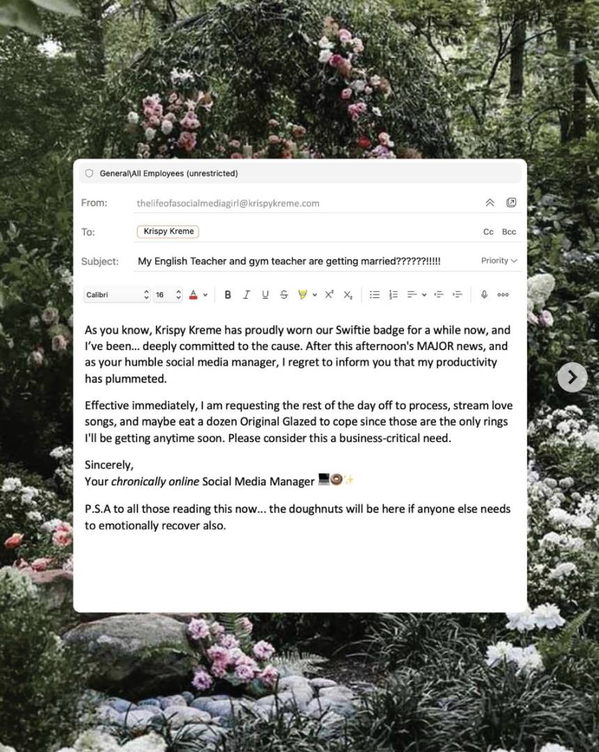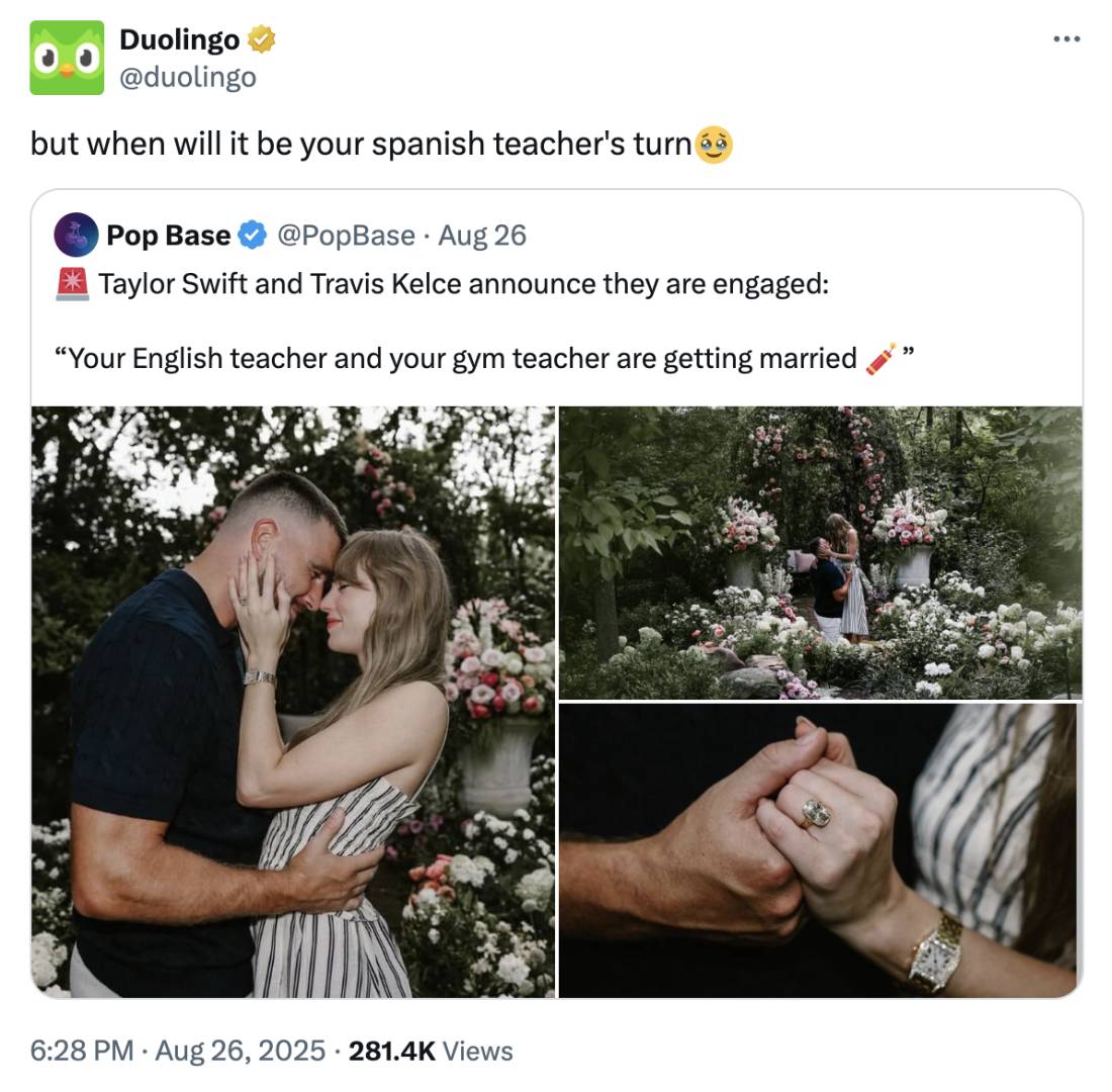 Brands were quick to get in on the action and make the most of the engagement news: Sour Patch Kids cheered “SUDDENLY I BELIEVE IN LOVE!”, Duolingo played on Taylor’s caption (“but when will it be your Spanish teacher’s turn?”), and Buffalo Wild Wings even pledged “WE WILL CATER THE WEDDING.” Meanwhile, Krispy Kreme rolled out “FREE doughnuts for the class,” and Panera served up a punny “It’s a loaf story, baby - just say yeast.” At this point, trendjacking Taylor isn’t a choice, it’s practically expected.